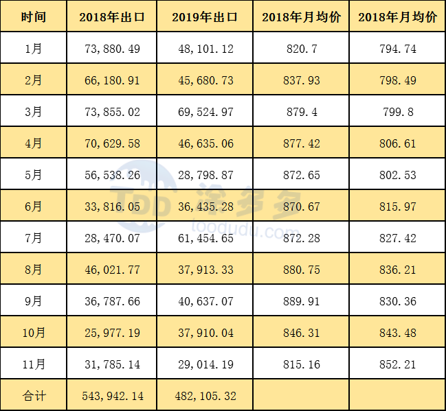 2019年1-11月累計出口數(shù)量為482105.32噸,同比去年減少61836.82噸。跌幅11.37%,進(jìn)出口抵消來看,國內(nèi)市場供需變化不大。出口數(shù)量的減少彌補了進(jìn)口的減少。