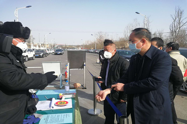 金永靈市長按常規程序進行測量體溫和登記信息,并翻閱出入大門人員信息登記臺賬。他詳細了解了集團公司疫情防控工作,總裁葉森和黨委副書記兼工會主席王立軍逐一回答。